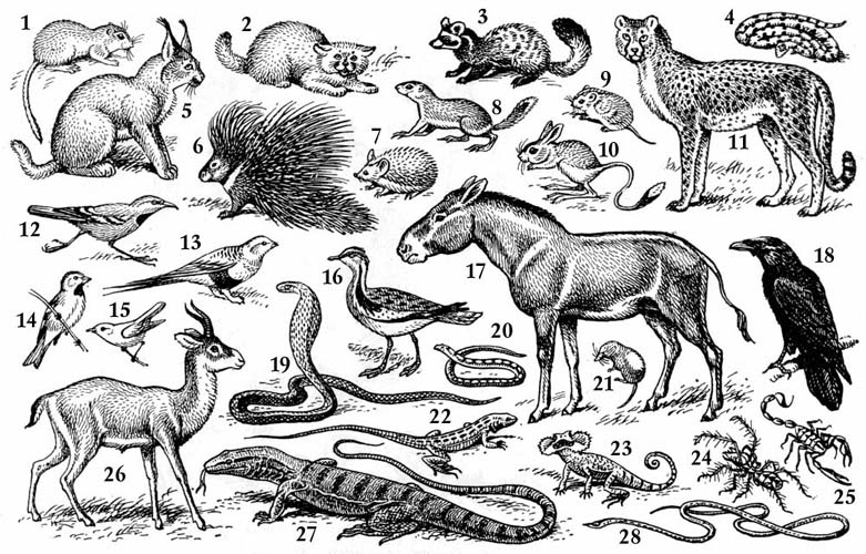 Представители пустынной фауны: 1 — большая песчанка; 2 — барханный кот; 3 — перевязка; 4 — эфа; 5 — каракал; 6 — дикобраз; 7 — ушастый ёж; 8 — тонкопалый суслик; 9 — селевиния; 10 — гребнепалый тушканчик; 11 — гепард; 12 — саксаульная сойка; 13 — саджа; 14 — пустынный воробей; 15 — пустынная славка; 16 — вихляй; 17 — кулан; 18 — пустынный ворон; 19 — кобра; 20 — степной удавчик; 21 — путорак; 22 — степная агама; 23 — ушастая круглоголовка; 24 — закаспийская сольпуга; 25 — пёстрый скорпион; 26 — джейран; 27 — серый варан; 28 — стрела-змея.