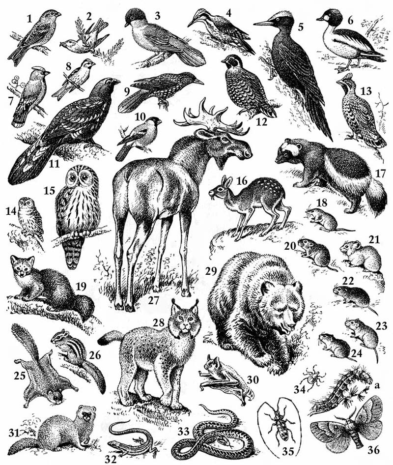 Представители таёжной фауны: 1 — щур; 2 — клёст-еловик; 3 — кукша; 4 — трёхпалый дятел; 5 — желна; 6 — обыкновенный гоголь; 7 — обыкновенный свиристель; 8 — обыкновенная чечётка; 9 — кедровка; 10 — снегирь; 11 — каменный глухарь; 12 — дикуша; 13 — рябчик; 14 — воробьиный сыч; 15 — длиннохвостая неясыть; 16 — кабарга; 17 — росомаха; 18 — обыкновенная бурозубка; 19 — соболь; 20 — лесной лемминг; 21 — северная пищуха; 22 — тёмная полёвка; 23 — красно-серая полёвка; 24 — красная полёвка; 25 — летяга; 26 — бурундук; 27 — лось; 28 — рысь; 29 — бурый медведь; 30 — северный кожанок; 31 — колонок; 32 — живородящая ящерица; 33 — обыкновенная гадюка; 34 —таёжный клещ; 35 — еловый дровосек; 36 — сибирский шелкопряд и его гусеница (а).