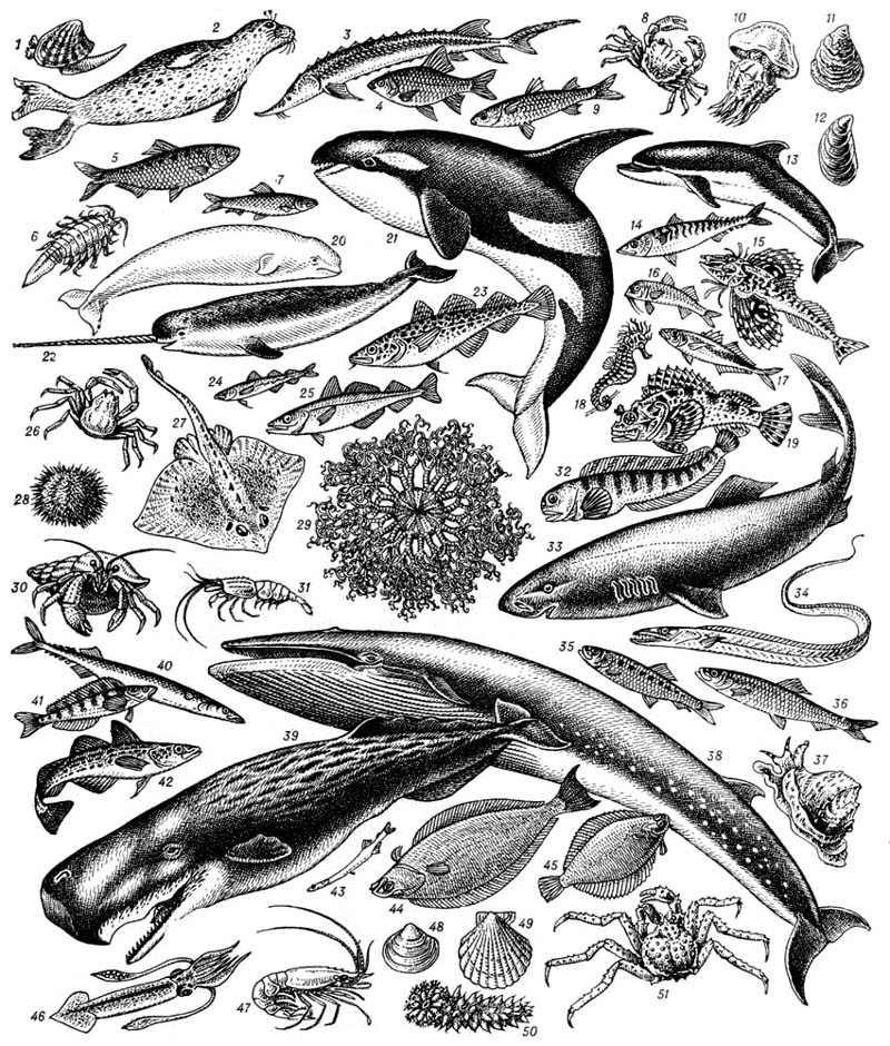 Представители фауны морей. Каспийского моря (1—7): 1 — треугольная дидакна; 2 — каспийская нерпа; 3 — севрюга; 4 — вобла; 5 — каспийский пузанок; 6 — морской таракан; 7 — тюлька. Чёрного моря (8—19): 8 — мраморный краб; 9 — кефаль; 10 — медуза-корнерот; 11 — устрица; 12 — мидия; 13 — афалина; 14 — скумбрия; 15 — морской петух; 16 — барабулька; 17 — ставрида; 18 — морской конёк; 19 — скорпена. Северных морей (20—33): 20 — белуха; 21 — касатка; 22 — нарвал; 23 — треска; 24 — сайник; 25 — сайда; 26 — краб хиас; 27 — звездчатый скат; 28 — морской ёж; 29 — офиура — голова горгоны; 30 — рак-отшельник; 31 — креветка сабинея; 32 — полосатая зубатка; 33 — полярная акула. Дальневосточных морей (34—51): 34 — сабля-рыба; 35 — сардина-иваси; 36 — океаническая сельдь; 37 — рапана; 38 — финвал; 39 — кашалот; 40 — сайра; 41 — восьмилинейный терпуг; 42 — минтай; 43 — лапша-рыба; 44 — белокорый палтус; 45 — желтополосая камбала; 46 — тихоокеанский кальмар; 47 — креветка северный чилим; 48 — сахалинская мактра; 49 — японский гребешок; 50 — трепанг; 51 — камчатский краб.