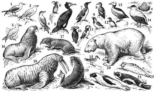 Представители фауны океанических побережий и островов: 1 — обыкновенная моевка; 2 — белая чайка; 3 — глупыш; 4 — короткохвостый поморник; 5 — берингов баклан; 6 — большая конюга; 7 — толстоклювая кайра; 8 — обыкновенный чистик; 9 — старик; 10 — топорик; 11 — тупик; 12 — люрик; 13 —сибирская гага; 14 — обыкновенная гага, самец и самка (а) на гнезде; 15 — кулик-лопатель; 16 — сивуч; 17 — калан; 18 — морж; 19 — северный морской котик; 20 — белый медведь; 21 —лысун; 22 — крылатка; 23 — обыкновенный тюлень.
