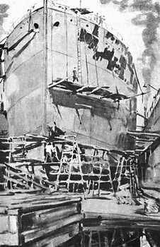 Советская живопись 1920—30-х гг. А. А. Шовкуненко. «В доке» (из серии «Днепрострой»). Акварель. 1930—32. Музей украинского изобразительного искусства УССР. Киев.
