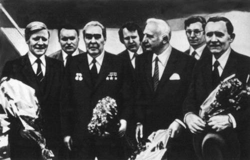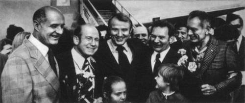 Встреча на аэродроме в Москве советских и американских космонавтов 20 сентября 1975, прибывших в соответствии с планом послеполётного этапа программы «Союз — Аполлон». Слева направо — Т. Стаффорд, А. А. Леонов, В. Бранд, В. Н. Кубасов, Д. Слейтон.