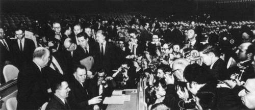 Чрезвычайная сессия Генеральной Ассамблеи ООН. Нью-Йорк. Июль 1967. Председатель Совета Министров СССР А. Н. Косыгин и министр иностранных дел СССР А. А. Громыко в зале заседаний.