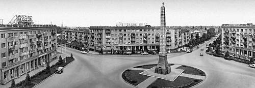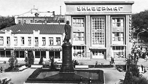 Северо-Осетинская АССР. Площадь Ленина с памятником В. И. Ленину (бронза, гранит, 1957, скульптор З. И. Азгур, архитектор Г. А. Захаров). На заднем плане — универмаг (1938, архитектор Л. М. Наппельбаум). Орджоникидзе.