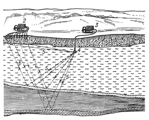 Рис. 1. Схема сейсморазведочных работ методом отраженных волн: 1 — сейсмоприёмники; 2 — сейсморазведочная станция; 3 — взрывной пункт; 4 — место взрыва; 5 — прямая волна; 6 — отраженная волна.