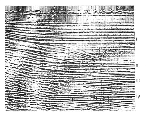 Рис. 3. Сейсмологический временной разрез (цифрами показаны отражающие границы по горизонтам): I — мел; II — триас; III — карбон; IV — девон.