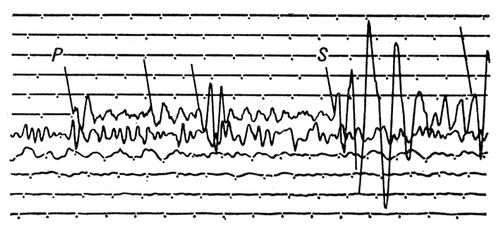 Сейсмограмма: P — продольные волны; S — поперечные волны.