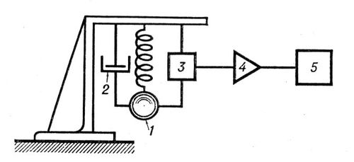 Рис. 2. Схема сейсмографа: 1 — груз сейсмометра; 2 — демпфер (устройство для гашения собственных колебаний груза); 3 — преобразователь движения груза в электрический сигнал; 4 — фильтр-усилитель; 5 — самописец.