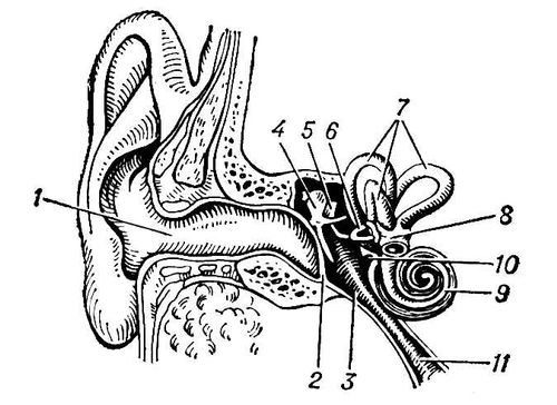 Схема строения уха человека: 1 — наружный слуховой проход; 2 — барабанная перепонка; 3 — полость среднего уха (барабанная полость); 4 — молоточек; 5 — наковальня; 6 — стремечко; 7 — полукружные каналы; 8 — преддверие; 9 — улитка; 10 — овальное окно; 11 — евстахиева труба.