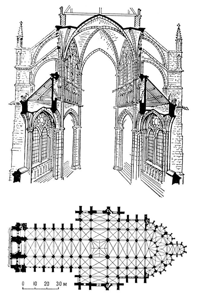 Готический храм. (Собор в Амьене, Франция. 1220—88. Разрез, план.)