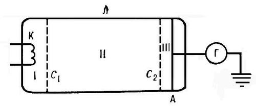 Рис. 1. Схема опыта Франка — Герца. В сосуде Л находятся пары ртути при давлении 1 мм. рт. ст . К — накаливаемый катод, С1 и С2 — ускоряющая и замедляющая сетки, А — анод. Ток регистрируется гальванометром Г.