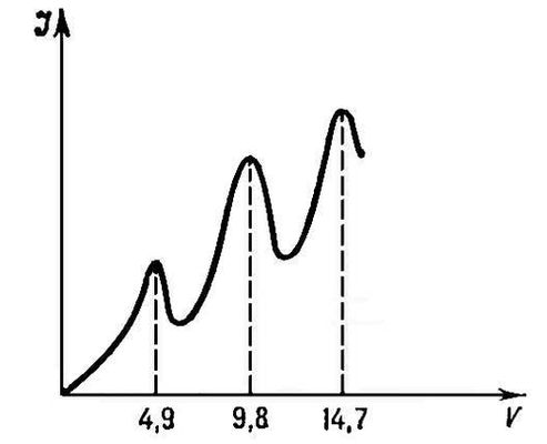 В опыте наблюдался монотонный рост I при увеличении ускоряющего потенциала вплоть до 4,9 в , т. е. электроны с энергией Е < 4,9 эв испытывали упругие соударения с атомами Hg и внутренняя энергия атомов не менялась. При значении V = 4,9 в (и кратных ему значениях 9,8 в, 14,7 в ) появлялись резкие спады тока (рис. 2 ). Это определённым образом указывало на то, что при этих значениях V соударения электронов с атомами носят неупругий характер, т. е. энергия электронов достаточна для возбуждения атомов Hg. При кратных 4,9 эв значениях энергии электроны могут испытывать неупругие столкновения несколько раз. Т. о. было доказано, что энергия атома изменяется не непрерывным образом, а скачкообразно и E = 4,9 эв – наименьшая порция энергии, которая может быть поглощена атомом Hg, находящимся в основном состоянии.