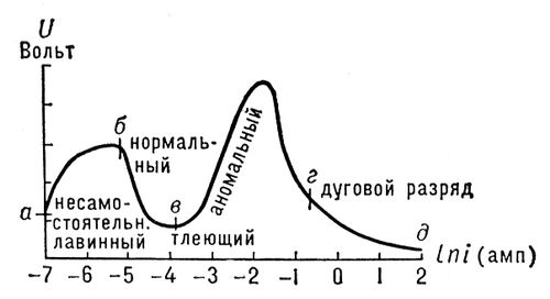 Рис. 3. Вольамперная характеристика разряда: аб — несамостоятельного лавинного; бвг — тлеющего; гд — дугового.