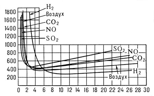 Рис. 2. Кривые Пашена для различных газов. По оси абсцисс отложены произведения p x d в мм рт. ст . x мм , по оси ординат - напряжение пробоя U3 в вольтах .