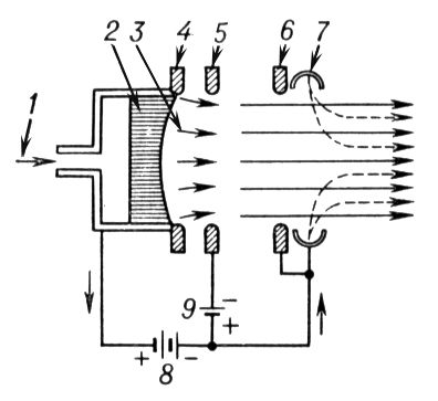 Рис. 3. Схема электростатического (ионного) двигателя: 1 — подвод рабочего тела; 2 — ионизатор; 3 — пучок ионов; 4 — фокусирующий электрод; 5 — ускоряющий электрод; 6 — замедляющий электрод; 7 — нейтрализатор; 8 — основной источник энергии; 9 — вспомогательный источник энергии.
