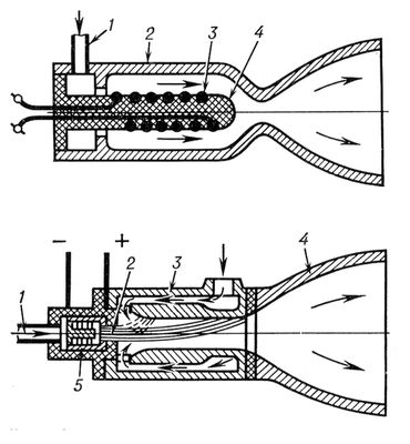 Рис. 1. Схема электротермического двигателя с поверхностным нагревателем: 1 — подвод рабочего тела; 2 — камера нагрева и сопло (вольфрам); 3 — нагревающий элемент (вольфрамовая проволока): 4 — опора нагревающего элемента. Рис. 2. Схема электротермического двигателя с нагревом при помощи дугового разряда: 1 — подвод рабочего тела; 2 — катод (вольфрам); 3 — анод (вольфрам); 4 — сопло (вольфрам); 5 — резьбовая втулка.