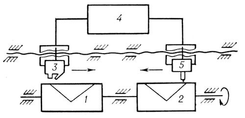 Упрощённая схема электрогравировального (цилиндрового) аппарата: 1 и 2 — цилиндры для закрепления оригинала и формной пластины; 3 — развёртывающее устройство с точечным источником света и фотоэлементом; 4 — функциональный электронный усилитель мощности и напряжения; 5 — гравирующее устройство.