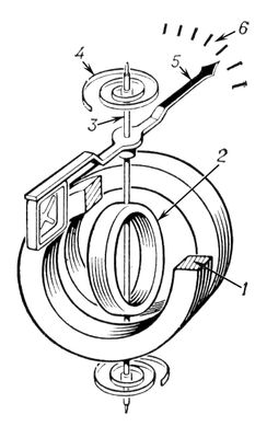 Электродинамический измерительный прибор: 1 и 2 — неподвижная и подвижная катушки; 3 — ось; 4 — пружина; 5 — стрелка; 6 — шкала.