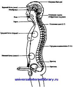 Заднесрединный канал начинается от промежности и поднимается по задней поверхности тела по позвоночнику от копчика вверх вдоль спины и шеи до макушки головы, затем спускается вниз по средней линии лба и носа и заканчивается под верхней губой на десне.