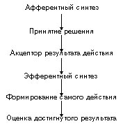 С точки зрения П. К. Анохина, создателя теории функциональных систем, структура поведенческого акта (схеме 5) представляет собой последовательную смену следующих этапов, или стадий: афферентный синтез; принятие решения; акцептор результата действия; эфферентный синтез; формирование самого действия; оценка достигнутого результата.