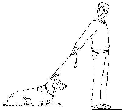 Для того чтобы посадить лежащую собаку, следует обернуться к ней вполоборота и после подачи команды поддернуть поводком вверх, заставляя ее сесть, а когда она сядет, похвалить.