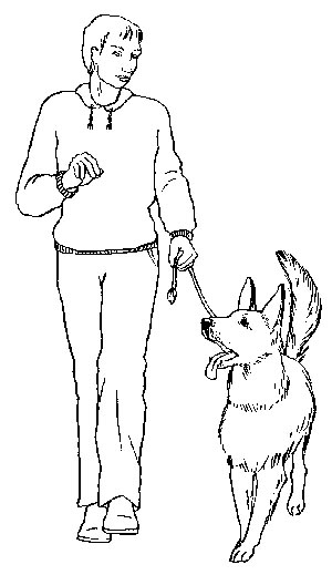 Дайте команду «Рядом!» и начните движение, увлекая собаку мишенью за собой. Если вы пользуетесь пищевой мишенью, то на первых занятиях должны скармливать кусочки пищи буквально через каждые 4—5 шагов, а то и чаще. Не форсируйте события, работайте в таком режиме не менее 2—3 дней. Необходимо добиться, чтобы собака поверила, что не только приближение к вам, но и движение рядом с вами для нее выгодно. Кстати, если собака пытается забежать вперед или захочет перебежать перед вами наискосок, что бывает, если держать мишень в правой руке, корректируйте поведение несильным подергиванием поводка левой рукой.