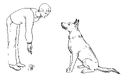 Командой «Сидеть!» дрессировщик фиксирует собаку и, подойдя к месту, демонстративно кладет несколько кусочков пищи на предмет. По возвращению к собаке, командой разрешает ей подойти к месту и съесть пищу, затем укладывает ее и хвалит. После небольшой паузы упражнение надо повторить и устроить перерыв.