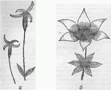 Оси симметрии различных порядков приблизительно осуществляются у цветов. Цветок на рисунке 9, а обладает осью симметрии 2-го порядка – при повороте на 1/2 окружности цветок совмещается сам с собой. При наличии оси 6-го порядка (рис. 9, б) совмещение происходит при повороте на 1/6 долю полного оборота. Цветы яблони, груши и многие другие имеют ось симметрии 5-го порядка. Помимо вертикальной оси симметрии у цветка на рисунке 9, а есть ещё две вертикальные плоскости симметрии, а на рисунке 9, б – 6 плоскостей симметрии. Сообразите сами, как они проходят.