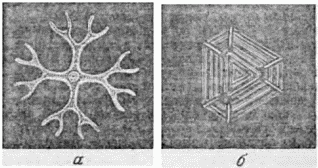 На рисунке 10 приведены примеры более сложных случаев симметрии, встречающихся в природе. Организм на рисунке 10, а обладает осью симметрии 4-го порядка, перпендикулярной плоскости рисунка, четырьмя осями симметрии 2-го порядка, лежащими в этой плоскости, и рядом плоскостей симметрии.