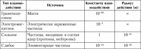 Из таблицы видно, что гравитационное взаимодействие гораздо слабее других взаимодействий. Радиус его действия неограничен. Оно не играет существенной роли в микропроцессах и в то же время является основным для объектов с большими массами. Электромагнитное взаимодействие сильнее гравитационного, хотя радиус его действия также неограничен. Сильное и слабое взаимодействия имеют очень ограниченный радиус действия.