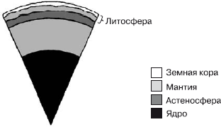 Внутреннее строение Земли. Земля состоит из земной коры, мантии и ядра. Литосфера (от греч. lithos – камень и sphaire – шар) – это верхняя твердая оболочка Земли, включающая земную кору и верхнюю часть мантии. Литосфера составляет в среднем от 70 до 250 км (рис. 7.4).