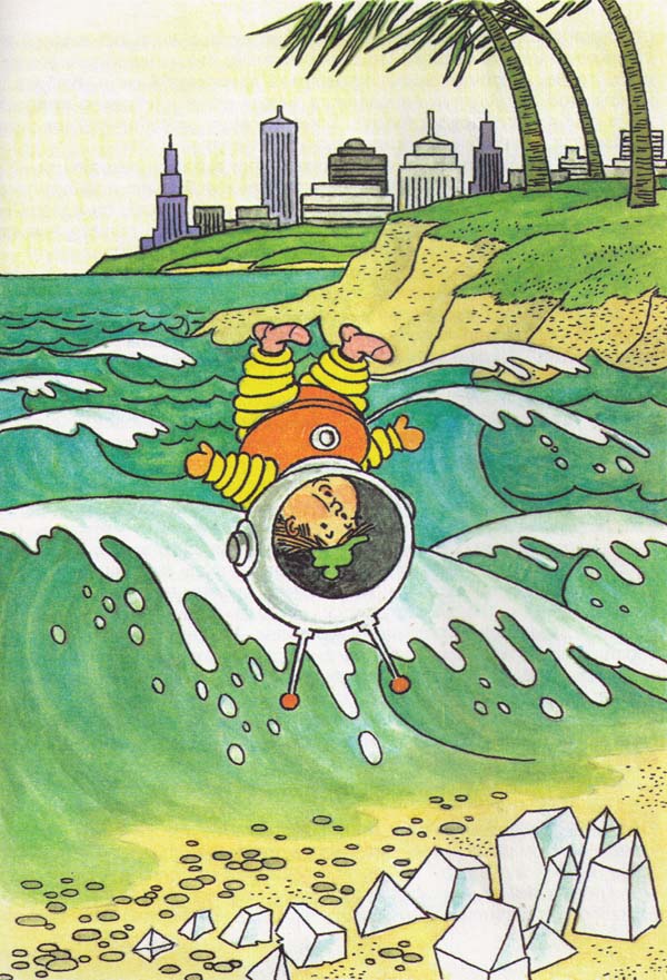 Узкий пологий берег, тянувшийся полосой вдоль моря, был ограничен с противоположной стороны обрывистыми, словно подмытыми водой, холмами, которые поросли сверху зелёной травкой и мелким кустарником. Сам берег был покрыт ослепительно белым песочком и какими-то прозрачными камнями, напоминавшими обломки ледяных или стеклянных глыб. Осмотрев внимательно несколько таких камней и полизав один из них языком, Пончик убедился, что перед ним вовсе не лёд и не стекло, а кристаллы обыкновенной поваренной соли. Выбрав пару кристаллов покрупней, он положил между ними несколько кристаллов помельче и принялся их толочь. В результате у него получилась мелкая, годная для употребления в пищу столовая соль.