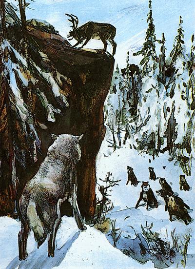 Олень выбился из сил. Голова упала под тяжестью рогов, шерсть взъерошилась и потеряла лоск. Ноги до костей были разорваны настом, и теплая кровь окропляла его след. Бежал он медленно. Скорее бы к скалам! Он вспомнил выступ над провалом и решил, что только там можно спастись. Но волки не стали ждать ни минуты. Пока держал их наст, Одноглазая решила кончать с оленем. На бегу она подала знак остальным — нападать. Вперед выкатилась Шустрая. Она обошла рогача полукругом и бросилась на него сбоку, вцепилась зубами в загривок, повисла на нем. Ей на помощь подоспели остальные. Взревел олень от страшной боли, и далеко по бору разнеслось громкое эхо…