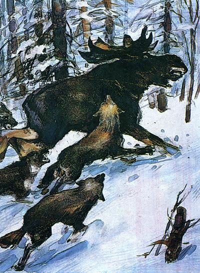 Но вот опять шорох, теперь ближе, яснее. Олень весь повернулся к нему и потряс угрожающе рогами, еще не понимая, кто это бежит его следом. Набрось ветром запах хищников, и он был бы уже далеко. Но вот между сосен по снежной белизне замелькали серые тени. Рогач всполошился, он узнал волков. Скорей, скорей на гольцы!
