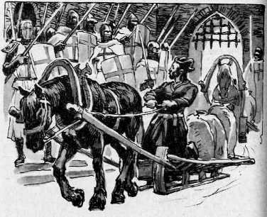 Рано утром поднялись ворота Вильяндиского замка и длинная вереница дровней, нагруженных мешками, потянулась во двор замка. Возчики испугались, увидев на дворе в этот ранний час рыцарей и воинов в полном вооружении. Большая часть дровней еще не успела въехать во двор, как вдруг ворота опустились. Воины со всех сторон набросились на возчиков; люди, едва успев крикнуть от испуга, оказывались изрубленными в куски. Затем воины стали копьями прокалывать мешки. Кое-кто из крестьян пытался выбраться из мешков, но стоило показаться чьей-нибудь голове, как ее тотчас раскалывали ударом. По обледенелому двору поползли дымящиеся ручейки крови. Крики раненых и умирающих сотрясали воздух. Но вопли продолжались недолго — их усердно прекращали копьями и мечами.