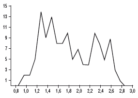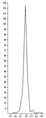 Рис. 18. Весовая диаграмма дирхемов халифов Мутасима, Васика, Мутеваккиля (833–861 гг.). По 169 экз. коллекции Эрмитажа