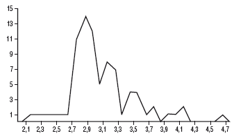 Рис. 22. Весовая диаграмма дирхемов халифа Мутамида (870–892 гг.). По 80 экз. коллекции Эрмитажа