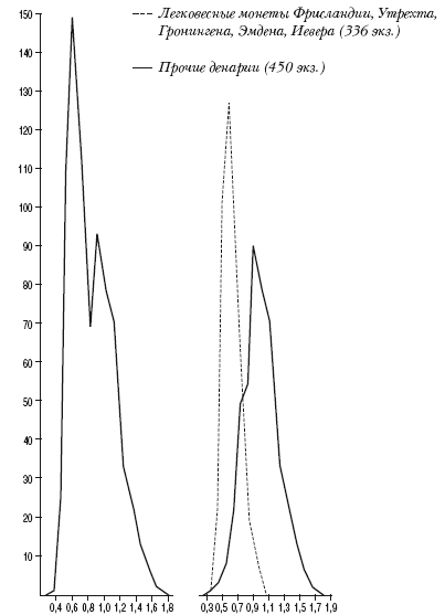 В кладах второй половины XI в. присутствуют две весовые группы монет. На диаграмме Скадинского клада (рис. 50) мы ясно видим наличие в обращении монет обеих групп. Вполне закономерно сопоставить наличие этих весовых групп с наличием в обращении второй половины XI в. двух различных типов монет. И в самом деле, разбив монеты по типам и анализируя их весовой состав уже дифференцированно (рис. 50), мы видим, что монеты основных германских типов имеют в это время вес 0,9–1,1 г, а монеты фрисландских и родственных им типов показывают расхождения в весе от 0,6 до 0,7 г. Те же результаты дает изучение веса монет громадного Вихмязьского клада (рис. 51).