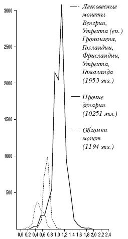 Наблюдения над весовыми нормами монет, обращавшихся в первой половине XI в., приводят к выводу, что обращению было в это время свойственно не только разнообразие монетных типов, но и разнообразие их весовых норм. О большой весовой пестроте дирхема последнего периода его обращения уже говорилось. Однако и нормы денариев не были единообразными. Германские пфенниги этого периода по своему весу немного превосходят 1,0 г, а в большинстве случаев равны 1,2 г. Английские пенни тяжелее: их норма колеблется в пределах 1,3–1,5 г. Все эти величины не соответствуют нормам северной денежно-весовой системы, установившейся с середины X в., и несоответствие норм приводит к постоянному дроблению монеты. В кладах первой половины XI в. обломки по своему числу во много раз превосходят количество целых монет.