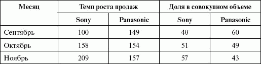 Увеличение объемов продаж планировалось на основе следующих данных. Сентябрьский объем продаж Sony был принят за 100 % и точку отсчета. Продажи техники Panasonic от этого уровня составляли 149 %. Соотношение объемов продаж между Sony и Panasonic в совместном объеме составляло 40 % на 60 %. Для того чтобы с учетом сезонного увеличения объема продаж превысить соотношение 50 % на 50 %, необходимо было поднять объем продаж техники Sony не менее чем вдвое до уровня 200 % в ноябре.