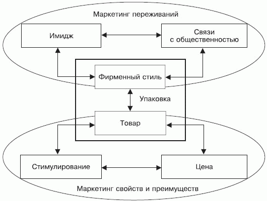 На рисунке 1.15 показаны наиболее тесные взаимосвязи между определенными предметами коммуникации и их отношение к маркетингу свойств и преимуществ и к маркетингу переживаний.