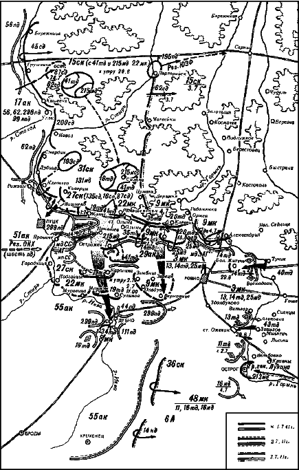 Танковое сражение вокруг Дубно закончилось. Подготовленный командованием 5-й армии на 1 июля повторный контрудар всех трех дивизий 22-го мекорпуса при поддержке остатков 9-го мехкорпусов с линии Вишнево, Олыка, Клевань (севернее Луцка и Ровно) никакого результата дать уже не мог – тем более, что еще 30 июня Ставка отдала командующим Юго-Западным и Южным фронтами распоряжение к 9 июля отвести войска за линию укрепрайонов по старой границе. [229]
