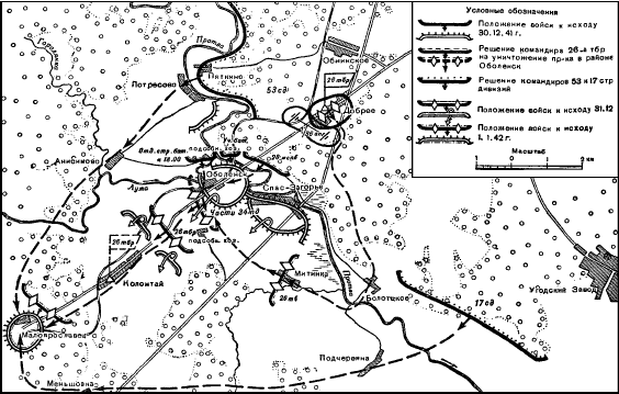 • отдельному стрелковому батальону и учебному батальону – к 18 часам 31 декабря занять исходное положение в районе подсобного хозяйства и ударом в направлении на северную и западную окраины Оболенска во взаимодействии с 26-м мотострелковым пулеметным и танковым батальонами уничтожить противника в Оболенске, в дальнейшем наступать вдоль шоссе на Малоярославец;