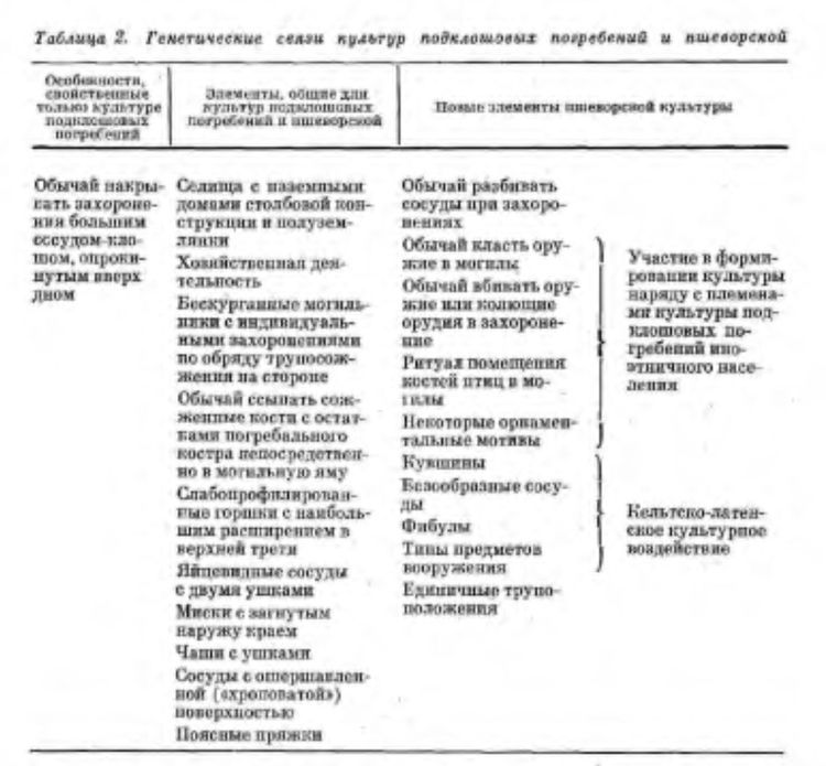 Таблица 2. Генетические связи культур подклошевых погребений и пшеворской