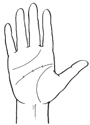 Такое деление линии очень удобно, если требуется определить точное время. Например, в возрасте 60 лет линия жизни заходит за большой палец в области запястья. Расстояние между воображаемой линией, соответствующей возрасту 30 лет, и областью, где линия жизни заходит назад по окружности вокруг большого пальца, соответствует 30 годам.