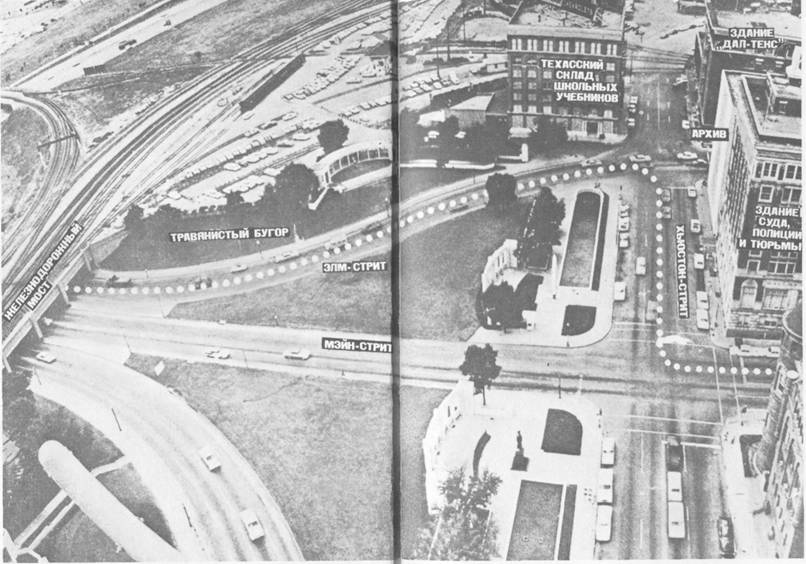 Далласская площадь Дилиплаза с «птичьего полета». На снимке видно, насколько безопаснее был первоначальный путь президентского лимузина: не снижая скорости проследовать прямо по Мэйнстрит к Дворцу выставок. Пунктирная линия обозначает окончательный маршрут, который привел Джона Кеннеди под перекрестный огонь на Элм-стрит.