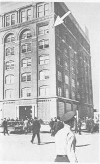Из крайнего окна (отмечено стрелкой) шестого этажа Техасского склада школьных учебников, согласно докладу комиссии Уоррена, вел огонь Ли Харви Освальд.