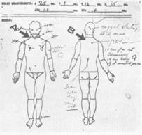 Еще один пример «путаницы и неразберихи» с описанием ран Кеннеди. Это — так называемая диаграмма, сделанная в ходе вскрытия трупа президента патологоанатомом Босуэллом. Стрелкой А на фигуре слева показано место раны в передней части горла. Стрелкой В на фигуре справа обозначена рана на спине, расположенная ниже точки, к которой ведет стрелка А. Впоследствии, однако, рана на спине была «передвинута» на 10 сантиметров вверх, чтобы соответствовать расположению раны в горле (см. с. 93–94).