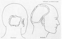 Схематическое изображение двух описаний черепно-мозговой раны Кеннеди. Слева рисунок, выполненный на основе показаний врачей Парклэндского мемориального госпиталя, справа — на основе характеристики раны патологоанатомами ВМС США (см. с. 101–102).