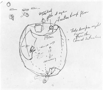Диаграмма черепа, сделанная в ходе вскрытия патологоанатомом Босуэллом. На левой стороне видны пометки «3 см» и «10», которые могут свидетельствовать о повреждениях левой части черепа, незафиксированных в официальном протоколе о вскрытии. Попытка уйти от обсуждения этой проблемы была предпринята с целью сохранить версию об одной пуле, попавшей в голову президента (см. с. 108–109).